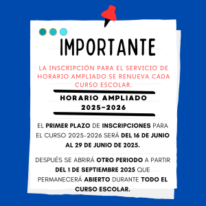 El Servicio de HORARIO AMPLIADO es una actividad extraescolar no obligatoria que se presta desde el primer día lectivo del curso escolar hasta el último.